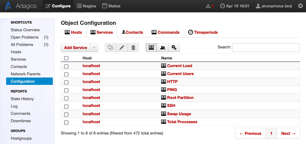From here, use Adagios to navigate the myriad information about your monitored hosts and services. More details are available through the options on the left menu, such as navigating to the Services page to see a list of monitored services: