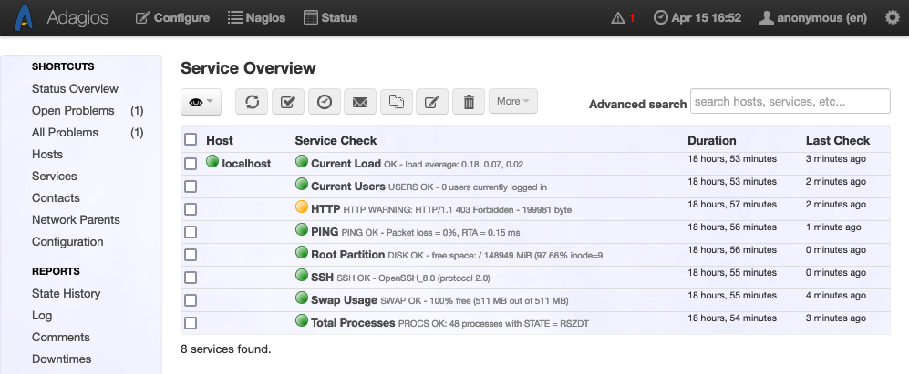 Now you have Adagios providing a clean and easy interface for your Nagios system. Be sure to look into all of the menu options the Adagios interface offers. This should give you a thorough idea of the features Adagios offers and how to make the most of them.