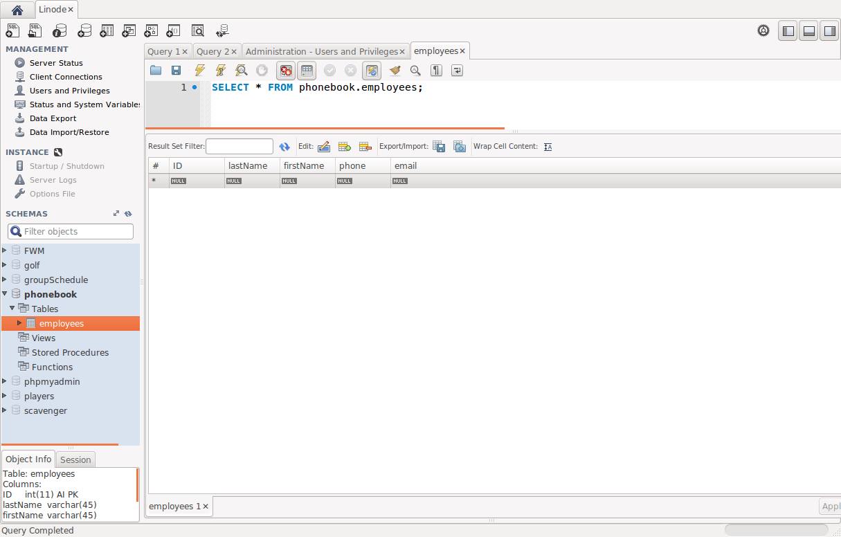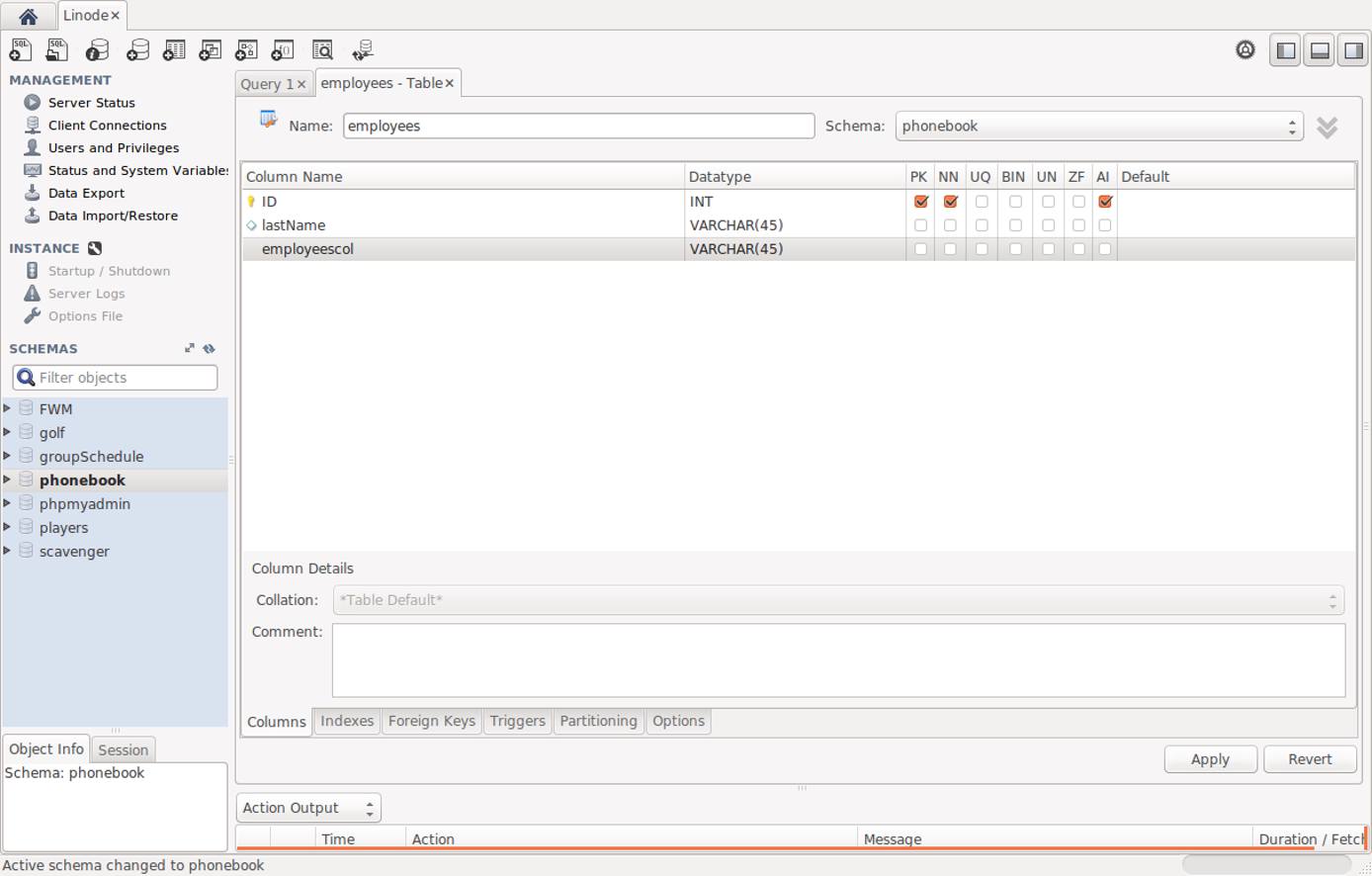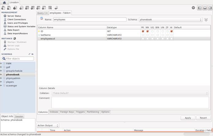 Now you’re back at the main database screen, and you see that phonebook has been added to the schema list. Double-click on any item in the schema list to switch to that database.