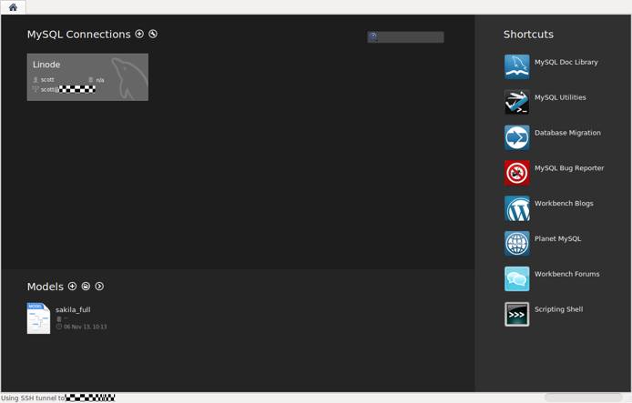 Workbench will prompt for passwords again, as needed. Then you’ll arrive at the database screen, from where you’ll do most of your work.