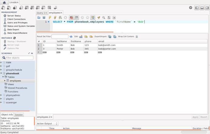 SELECT * FROM phonebook.employees WHERE `firstName` = 'Bob'Click on the lightning bolt to run the query. You should get results like this: