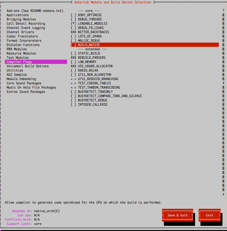 When you’ve selected these and any other modules or build options you may want, use the Save & Exit button. Then issue the following commands to finish the installation: