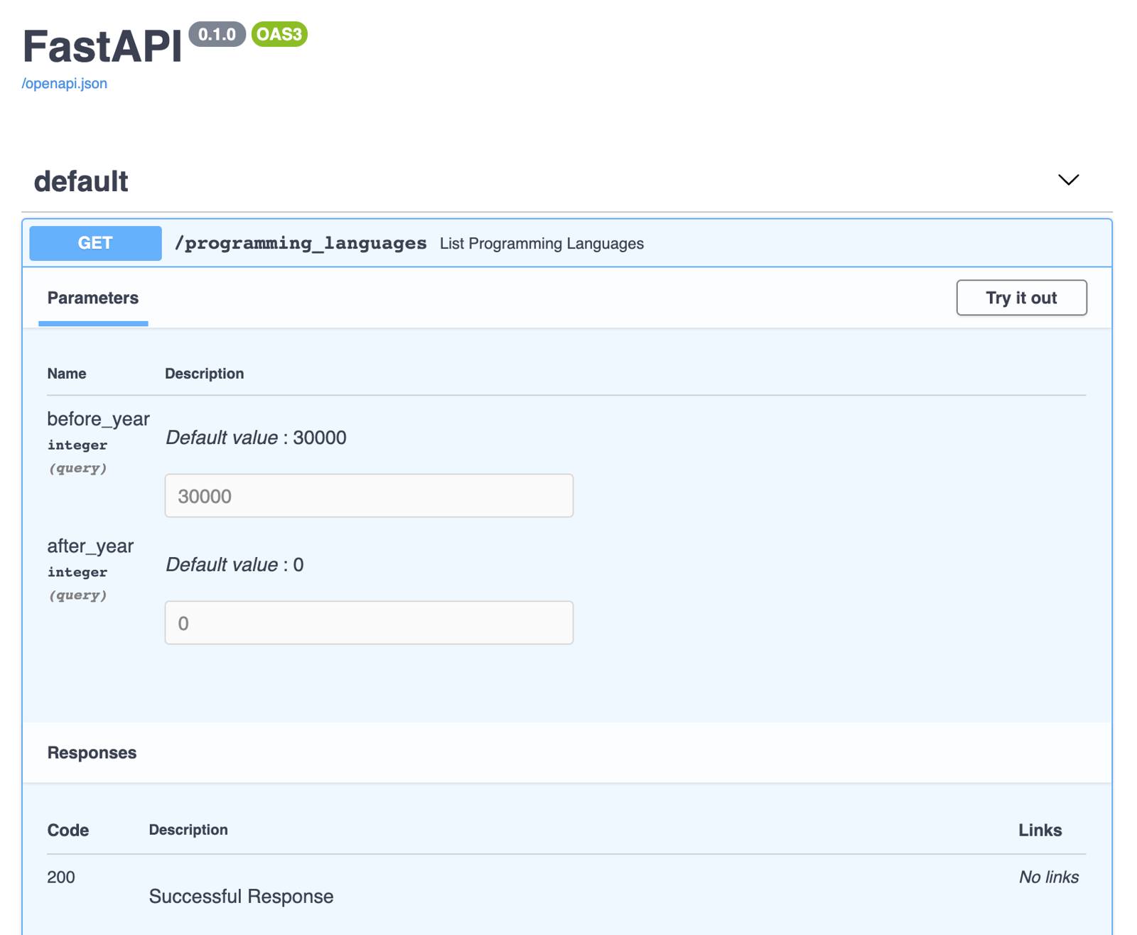 FastAPI provides automatic documentation that follows the OpenAPI specification. In our CRUD Write Operations: Use FastAPI to Write an API guide, you write a List Programming Languages endpoint with the annotation, @app.get('/programming_languages') as seen in the following example: