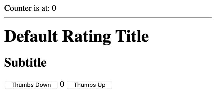 1 2 3 4 5 6 7 8 9 10 11 12 13 14Vue.component('rating-counter', { props: ['title'], data() { return { count: 0 } }, template: `<div> <h1>{{ title }}</h1> <button v-on:click="count--">Thumbs Down</button> {{ count }} <button v-on:click="count++">Thumbs Up</button> </div>` })