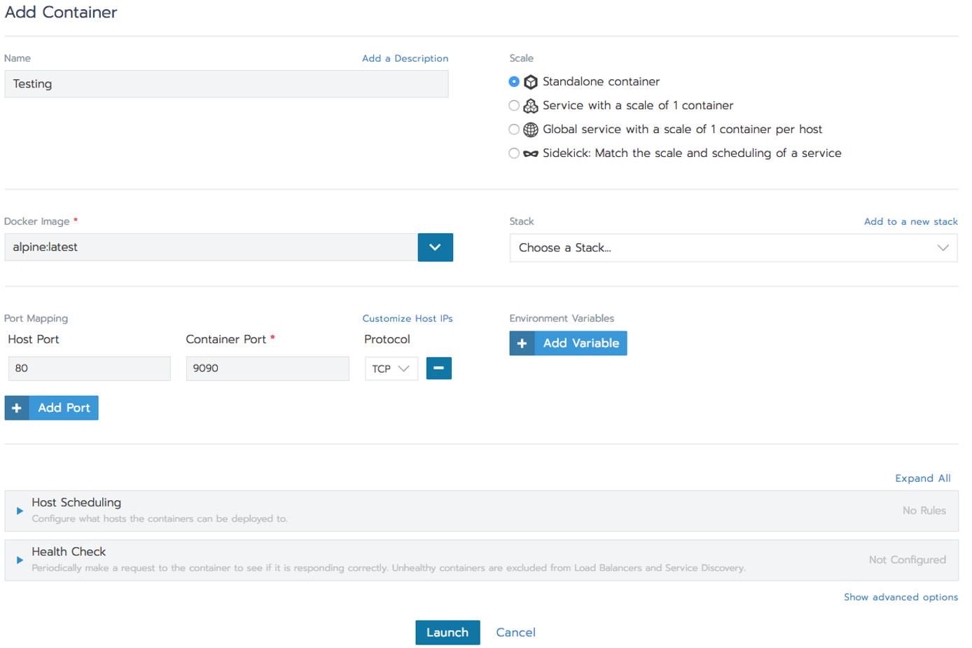 You can launch individual custom containers with Rancher in the Containers section of the application: