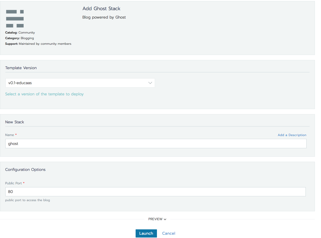 As an example, install the Ghost blog platform. This will showcase Rancher’s interaction with Docker.