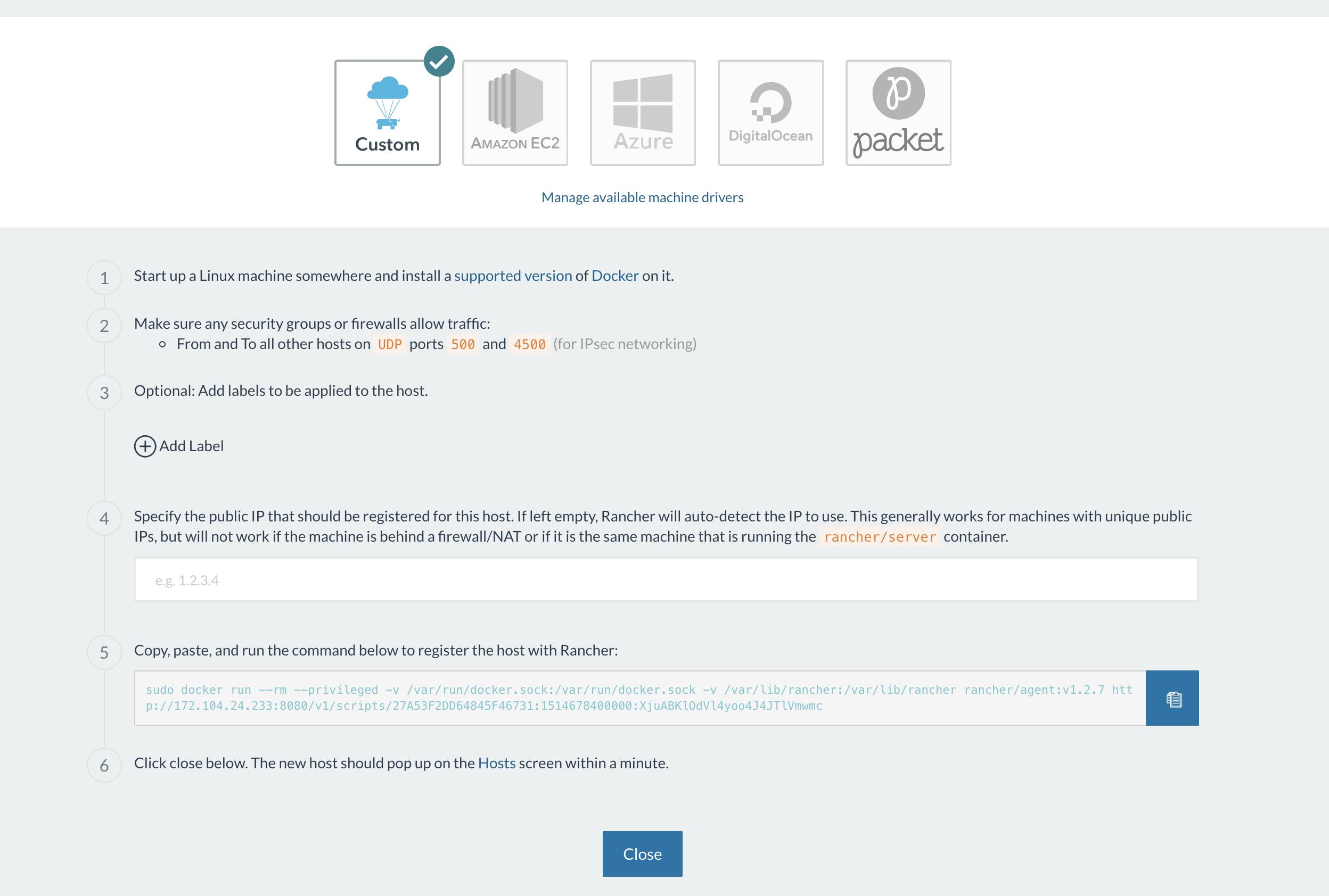 In order for Rancher to deploy containers on remote hosts, each host must be registered with the Rancher server. This guide will use the Linode running the Rancher server as the host, but any number of Linodes can be added using the these steps.