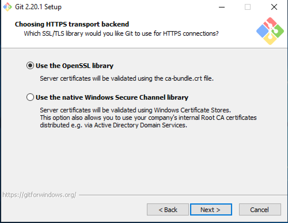 Select the SSL/TLS library that you want Git to use for HTTPs connections: