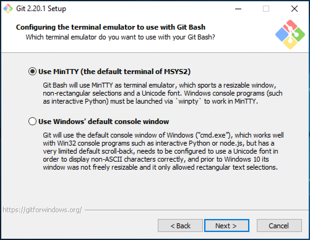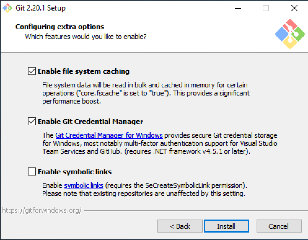 git pull, and some extra configuring options.For the simplest installation, keep MinTTY for the terminal emulator, use the default behavior (fast-forward or merge), and enable file system caching in configuring extra options. When you are done selecting your configuration options, click Install at the end.