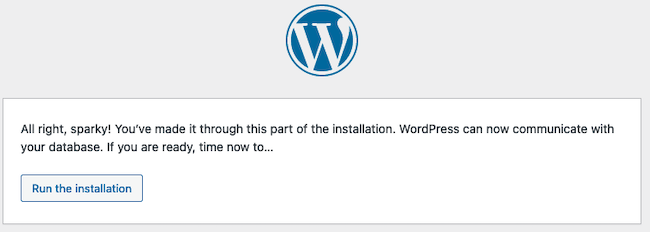 If the information is correct, WordPress confirms the database connection is successful. If there is a connection error, WordPress prompts you to correct the errors. Most failures are due to an incorrect user name or password. Click the Run the installation button to continue.