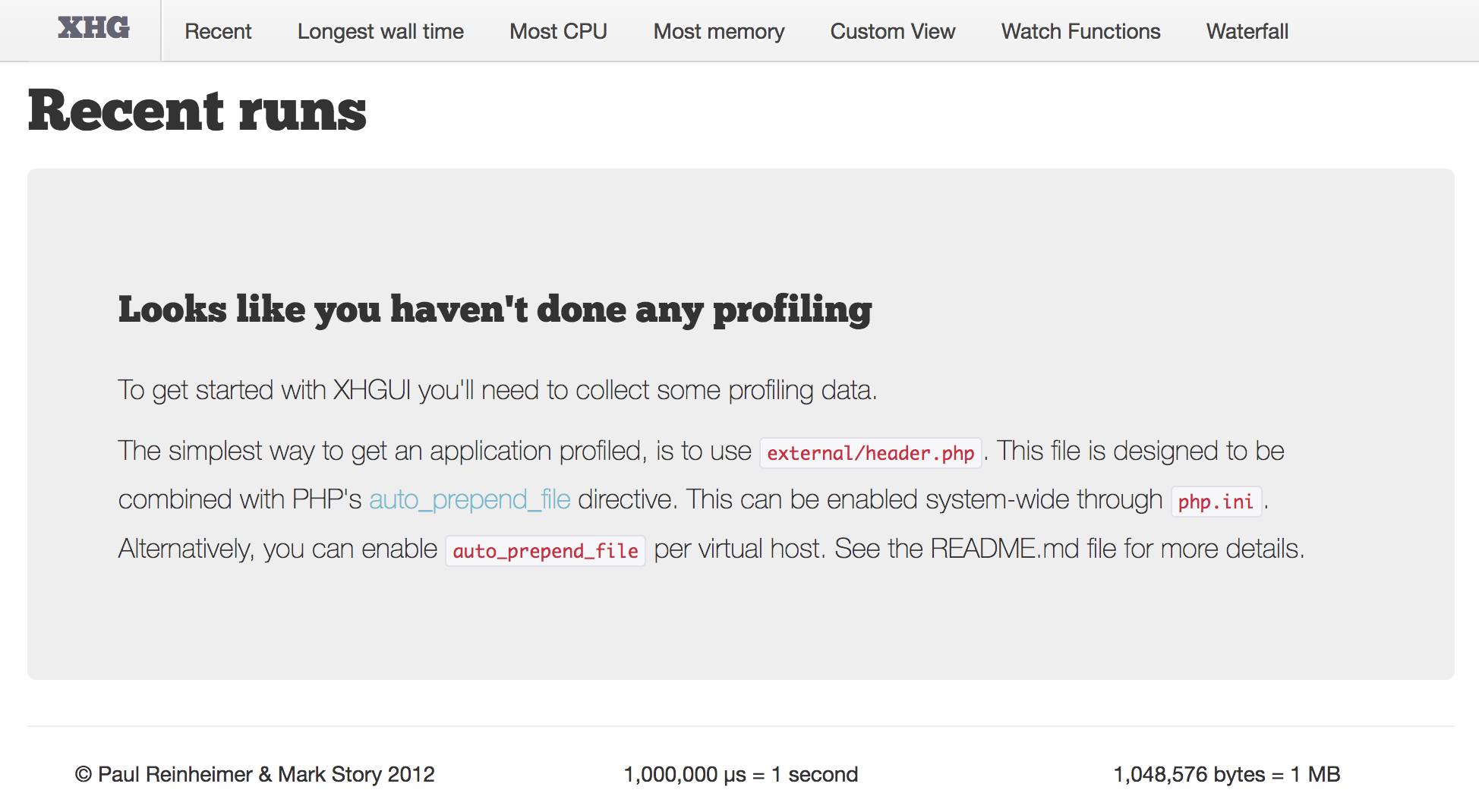 'profiler.enable' => function() { return true; }Your XHGUI app should now be collecting profiling data for requests on your site. The XHGUI app can be reached on port