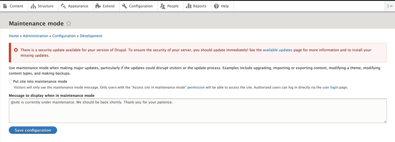Check the box next to “Put site into maintenance mode.” Enter a message if desired, and click Save Configuration.