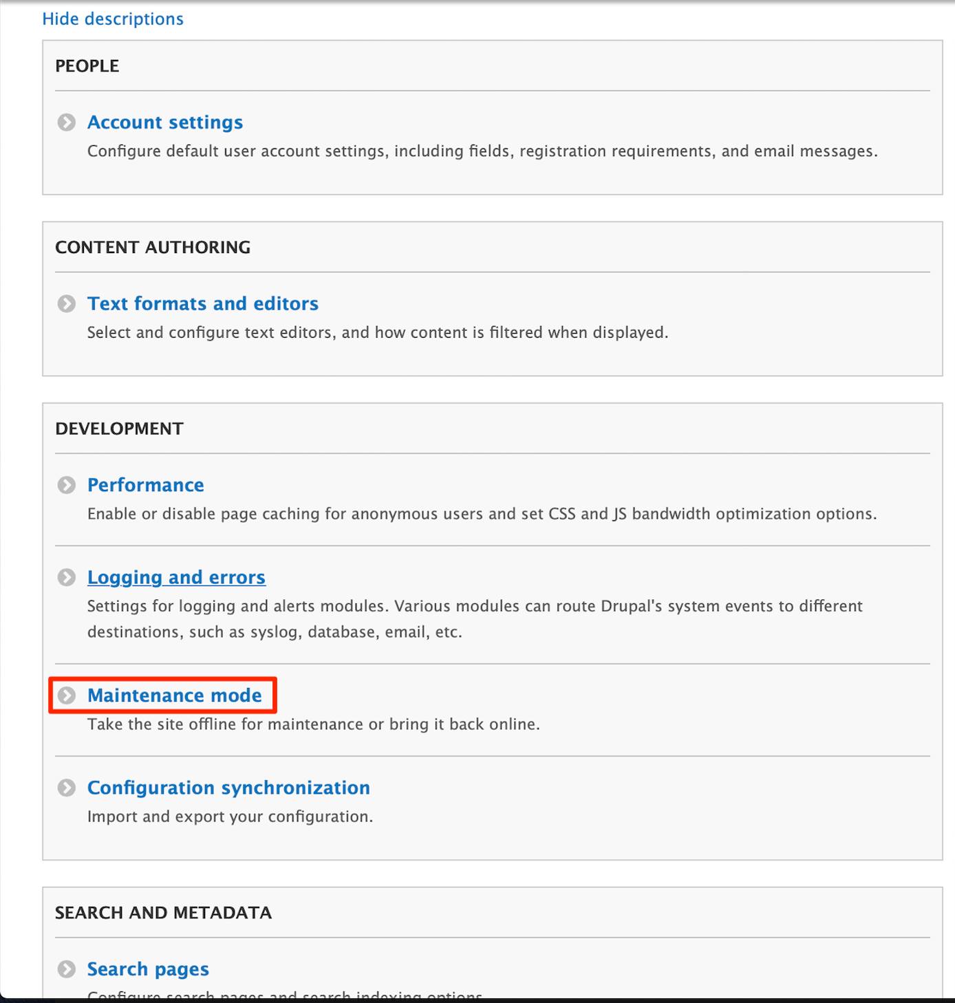 Note The Next Steps section includes a list of Drupal security modules you may consider installing.Rebuild the site’s cache by navigating to the Admin Toolbar and click on Configuration. Under the Development heading, click on Performance. Finally, click on the Clear all caches button.