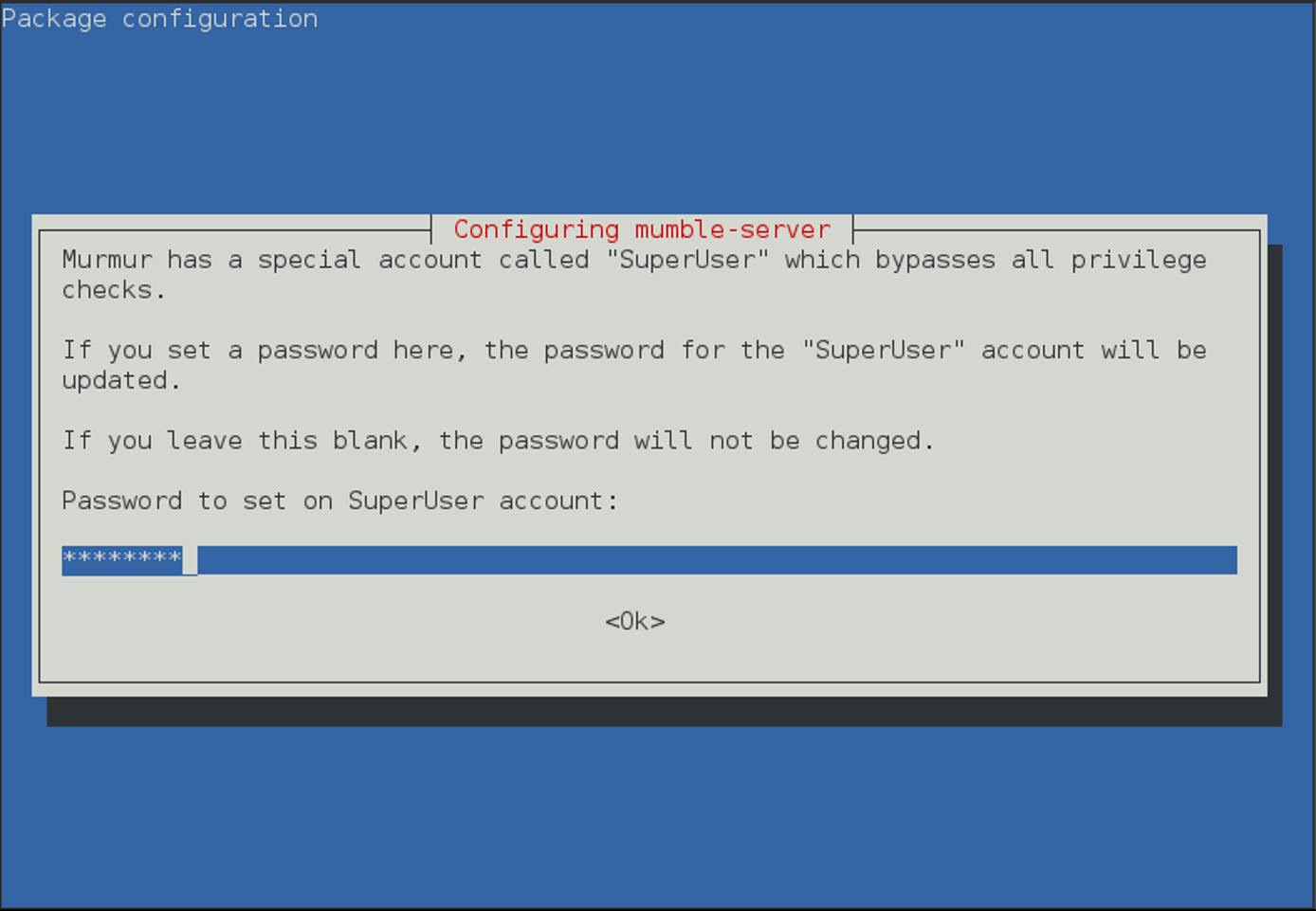 Next, you will be asked to set a SuperUser password. Murmur has a SuperUser account that lets you change server settings from the Mumble client. You may set it to whatever password you want.