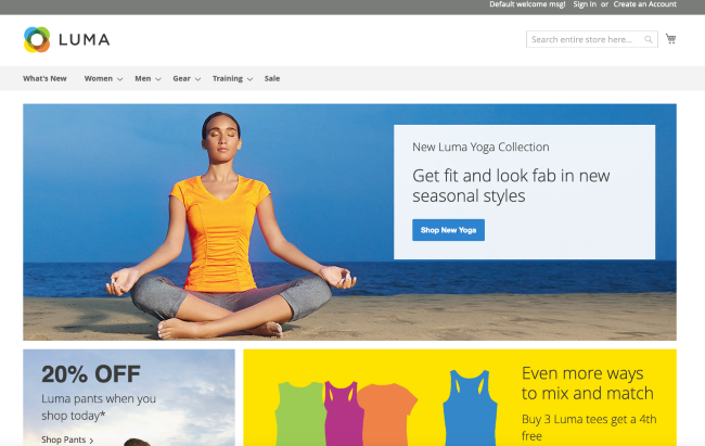 base-urlduring the installation. If you downloaded the sample dataset, you’ll see a storefront mock-up complete with images. Otherwise the page displays a sample template with some generic default messages such as “homepage content goes here”.