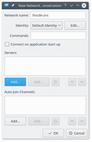 Enter a name for the new network. For this example the network is linode-znc. Then click ‘Add…’ to open the dialog to add the server.