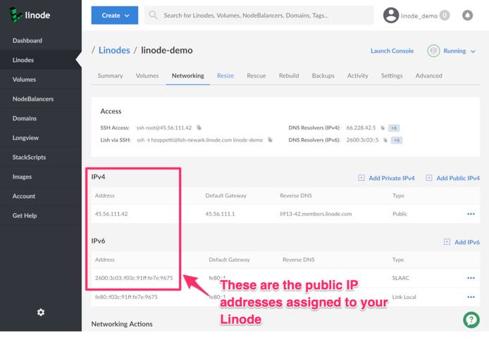 Copy the addresses in the Public IP sections. In this example, the Linode’s IPv4 address is