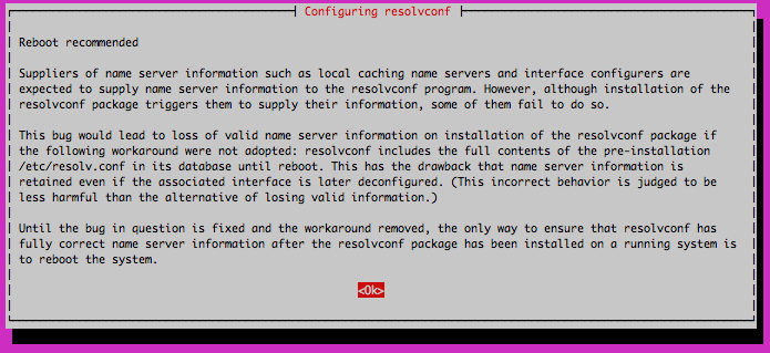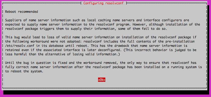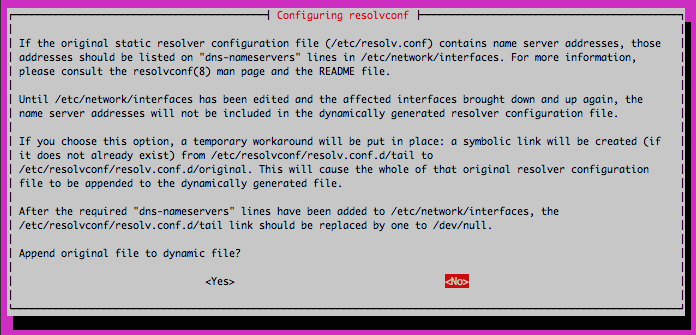 dnsmasqpackage and modify the/etc/opnevpn/server.confpackage. Install and configure thednsmasqpackage with the following command:apt-get install dnsmasq && dpkg-reconfigure resolvconfNote If you are using Debian 7, replace this command withapt-get install dnsmasq resolvconfand skip steps 7 through 9You will be presented with a series of options in an ncurses menu. First, choose yes to prepare