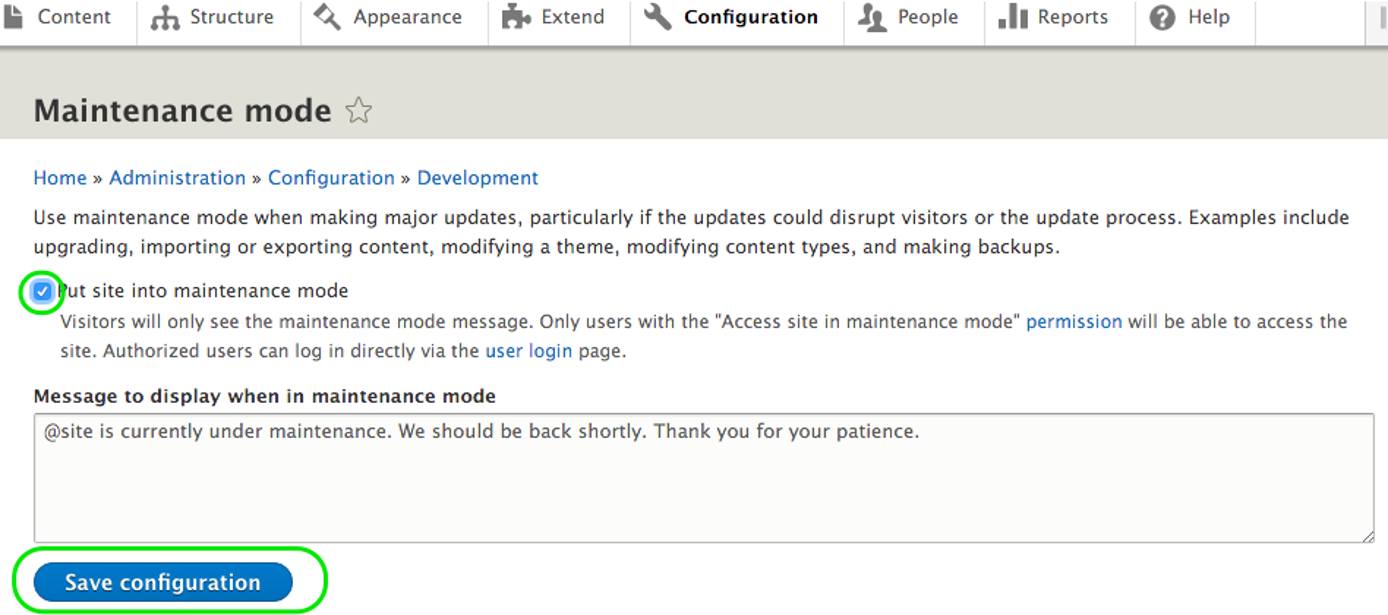 Check the box next to “Put site into maintenance mode.” Enter a message if desired, and click Save Configuration.