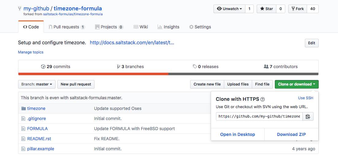 upstreamremote, so you can easily pull any changes made to the formula by the repository’s maintainers or contribute back to the project. This step is not required.git remote add upstream https://github.com/saltstack-formulas/timezone-formulaYou now have a local copy of your forked