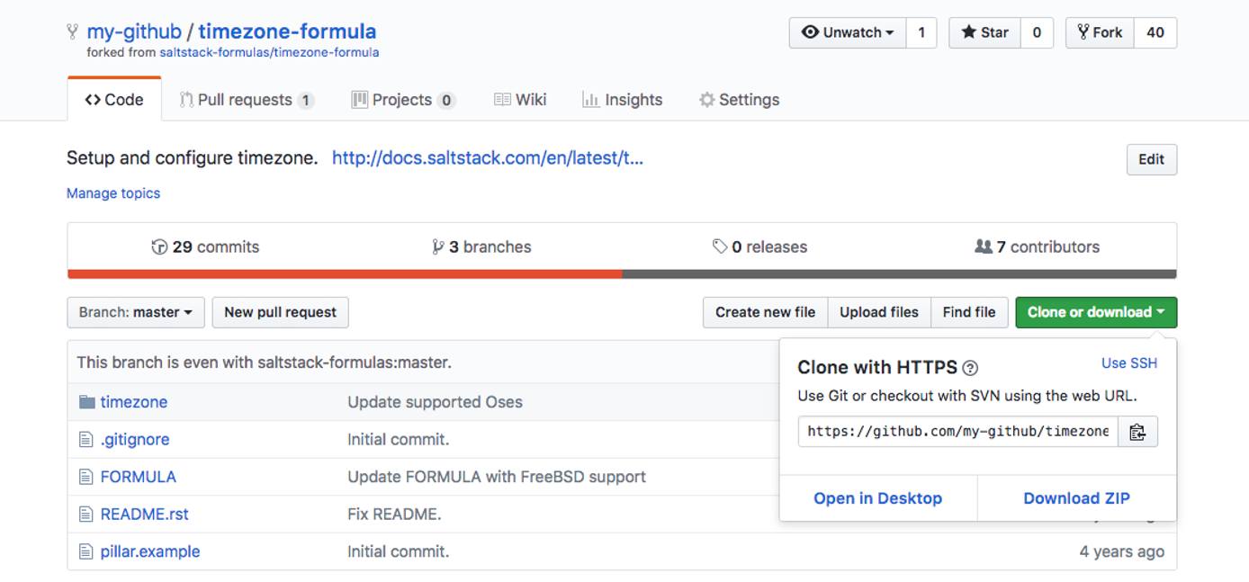 In this section you will fork the timezone-formula from the official SaltStack GitHub page to your GitHub account and clone it to a local repository.