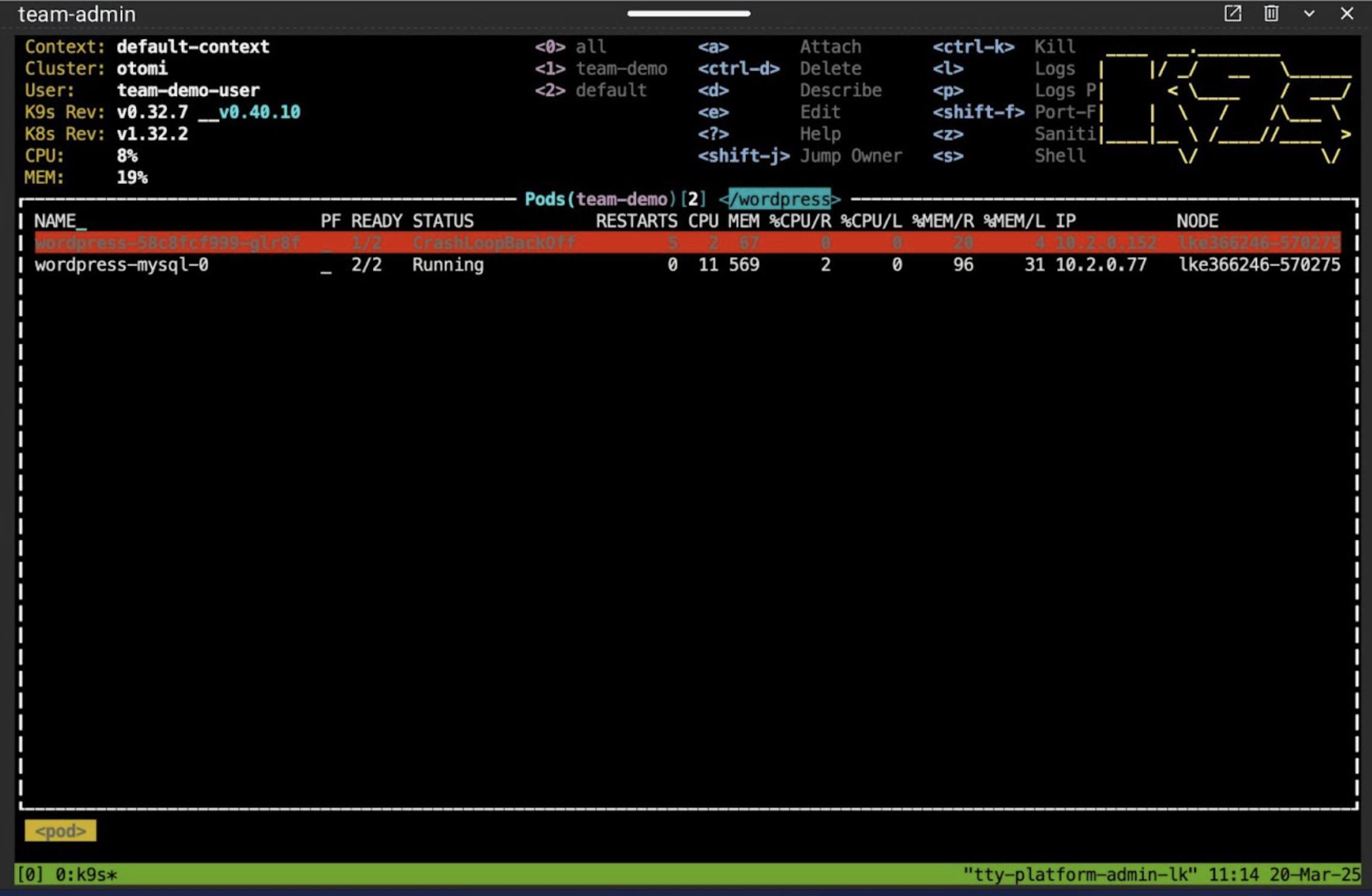 Enter the following command to launch the k9s interface once the Shell session has loaded. k9s is an open source, terminal-based Kubernetes user interface pre-installed with Akamai App Platform: