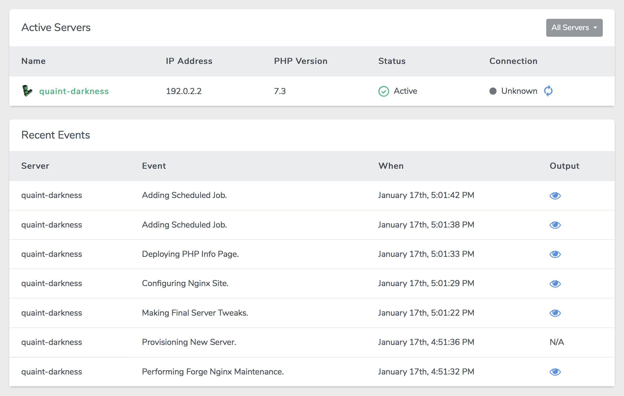 Forge will now perform the steps necessary to create and configure a Linode based on the settings you provided. The new server will appear in the Active Servers section, and a list of recent events representing the server’s configuration will appear below it.