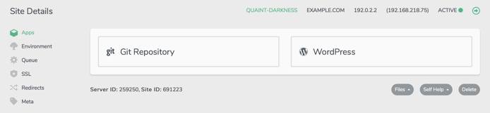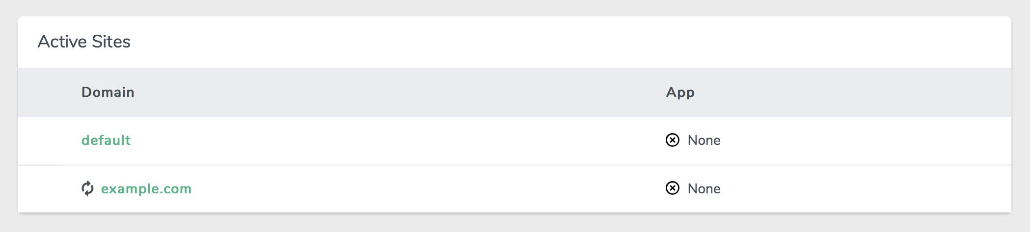 Option Description Root Domain Your website’s domain. Project Type Your project type. If you are building regular PHP, you can choose General PHP/Laravel. Other options include Static, HTML, Symfony, and Symfony (Dev).Web Directory The directory from which public files will be served. You will need to make sure your website’s files are in this directory in your source code repository. Your new site will appear below the form in the Active Sites panel: