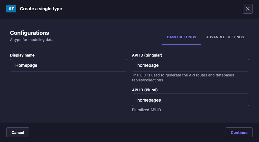 Homepagesingle type. Navigate to Content-type Builder, and select the Create new single type option from the inner left menu. EnterHomepagefor the Display name field, and as before the API-related fields should automatically populate. Click Continue.Just as with the collection type above, select Text for the field, and name it