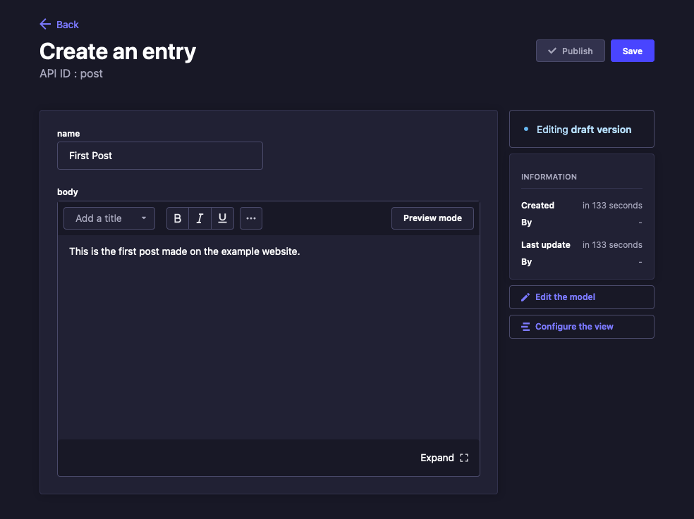 This guide’s example creates three entries using the steps above. Each entry in this collection type has name and body fields, and these fields are filled out as follows for the example content.
