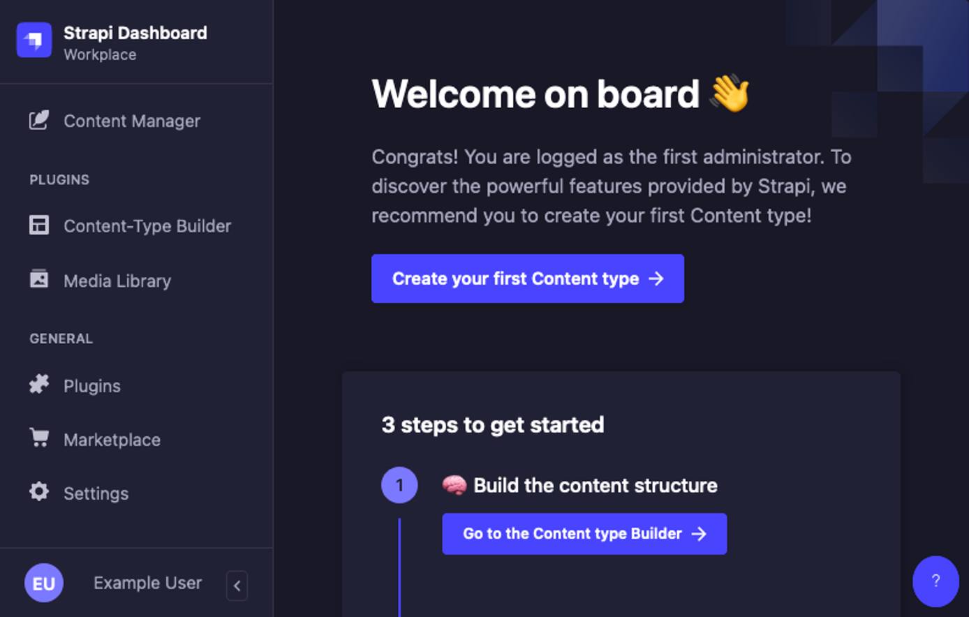 As discussed above, you can now navigate to the administrator interface for your Strapi instance, where you are prompted to create an initial administrator user. Doing so takes you into the administrator panel.