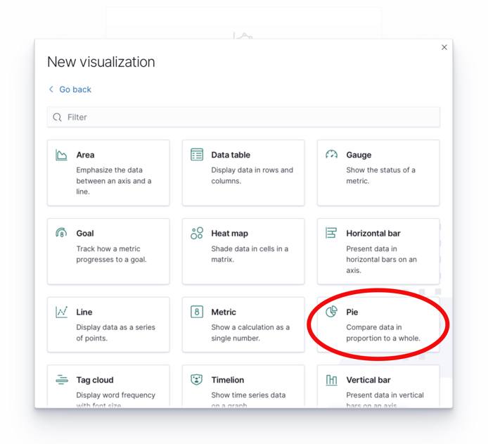 Select Pie from the choices that appear to create a new pie chart. Note that you may need to scroll down to find the Pie visualization: