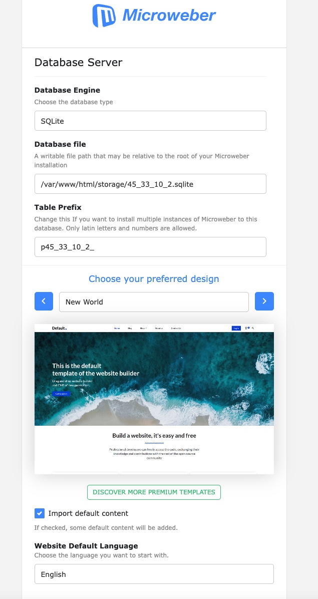2. Complete the initial setup for that appears. This includes setting the database settings, selecting the preferred website design, setting the default language, and more.