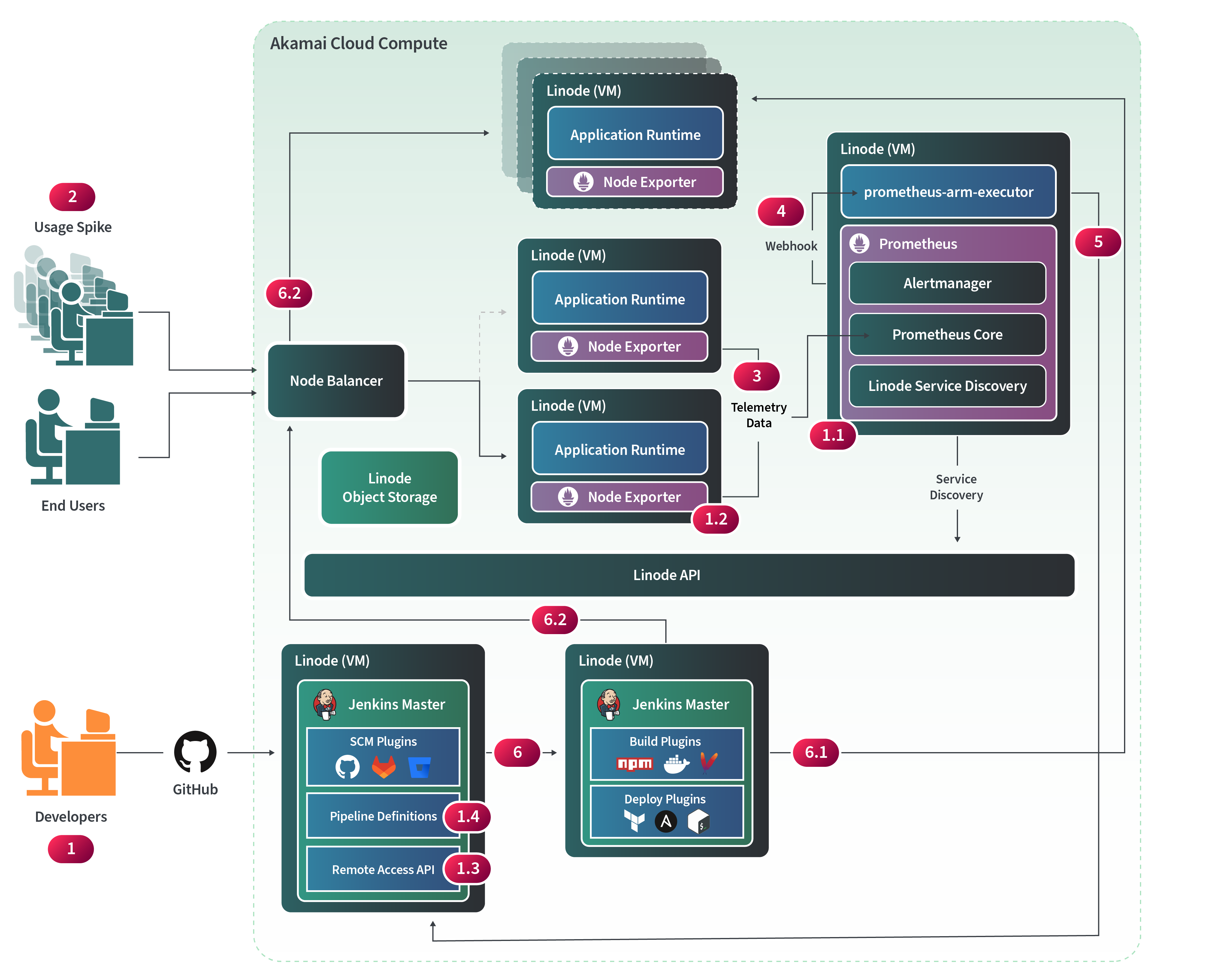 By default, Prometheus provides the necessary tooling for this use case. A Node Exporter, which is a service that runs on the application nodes, is exposed on port 9100, and allows the Prometheus node to scrape telemetry data from them in regular intervals. Prometheus uses a built-in Linode integration that enables discovery of the nodes that it will regularly scrape. Using a defined metric, like a certain CPU threshold, Prometheus can trigger alerts, and use a webhook receiver to send the event to an open source executable service called prometheus-am-executor. This pattern can be extended to scale up or down the application instances, or a number of other deployment use cases by sending events to the Jenkins remote access API.