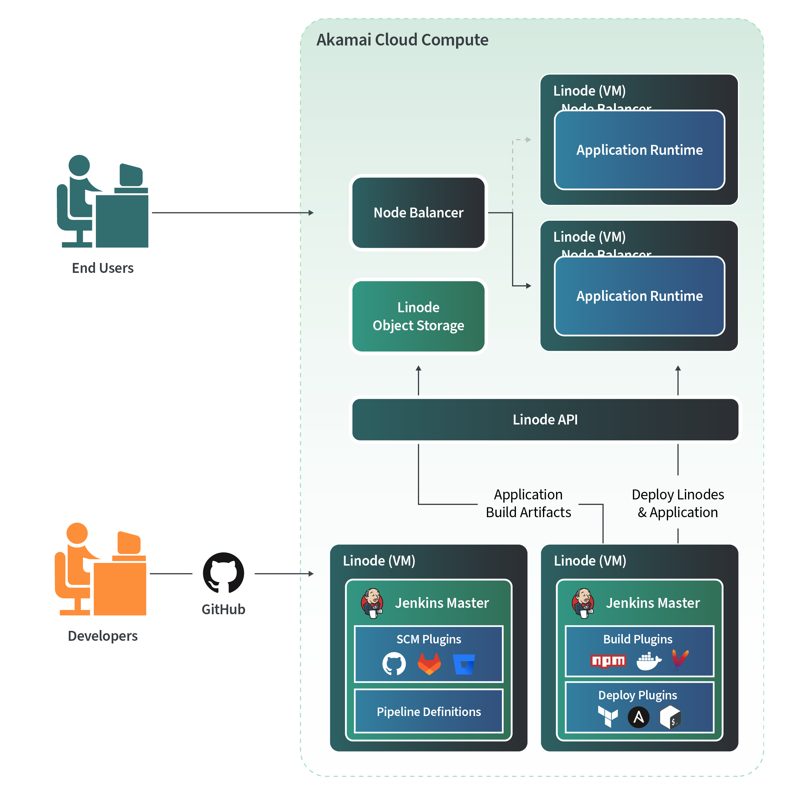 Figure 1 illustrates a common highly available application runtime that includes a delivery pipeline for developers to build the application, integration with Linode API through our Terraform provider, Ansible community package, or Linode CLI. The system baseline illustrated here uses GitHub for source control management (although GitLab, Bitbucket, or other SCMs that Jenkins supports would work as well), Jenkins deployed on Compute Instances (Linode virtual machines), and using Object Storage as a artifact repository. For additional practical details on setting Jenkins up, see How to Automate Builds with Jenkins.